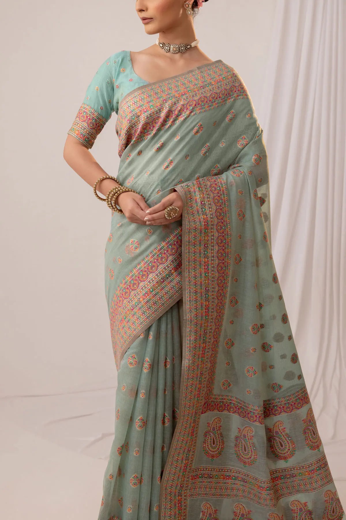 Many of our collections feature handwoven and handcrafted sarees made by local artisans using traditional techniques passed down through generations.